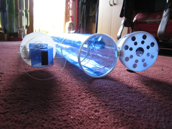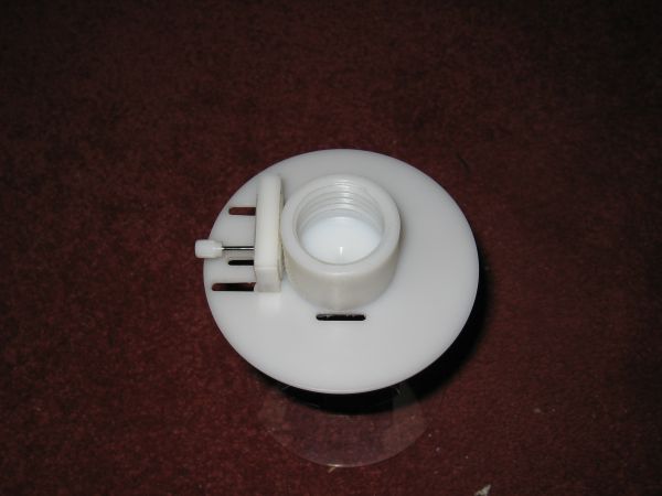 Die beiden Langlöcher in der Scheibe und der Bodenplatte dienen der Durchführung der beiden Schockbänder für den Fallschirm. Der 600mm Schirm paßt perfekt in die Kammer.
