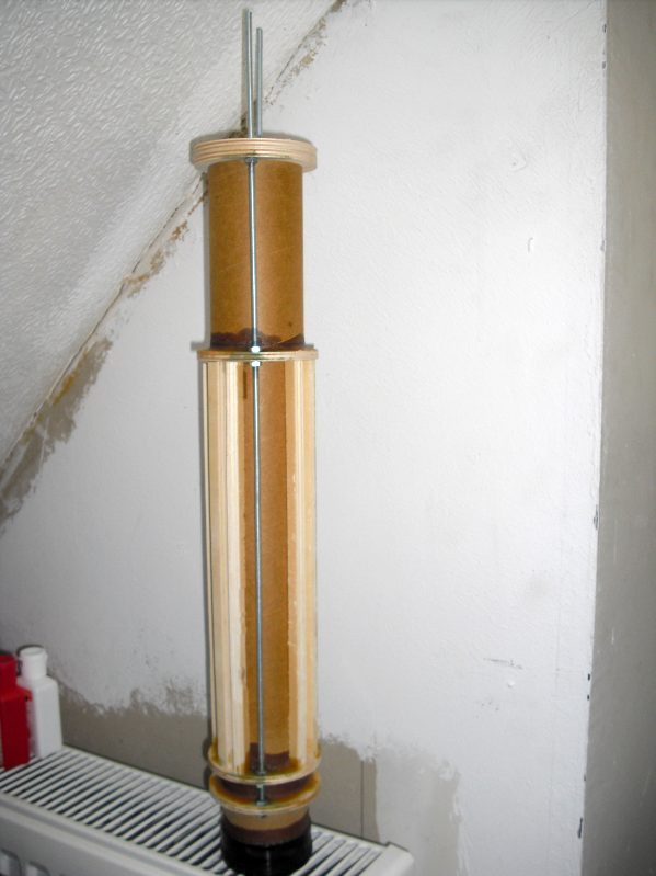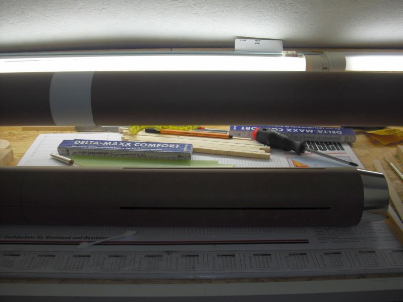 Wie manche ja wissen, hat meine geliebte Infected den SRT 2012 nicht überlebt. Die Reste habe ich Markus geschenkt und wollte auch mit der Rakete abschließen. Da es aber die Rakete war, mit der mich Wolfgang ( eigentlich wollte ich nur mal am SRT 2008 gucken kommen ) angefixt hatte, ging sie mir nicht so ganz aus dem Kopf. Schon vorher hatte ich ein tolles Design bei Jürgen Mehlin gesehen und er schicke mir auch noch nach dem P2 Kurs das passende RockSim File. Nun denn, die Infected gabs nicht mehr und die Teile für Jürgens Design hatte ich ja auch schon. Zum gleichen Zeitpunkt hatte ich mir aber schon die BAT gekauft. Eigentlich wollte ich mal eine Rakete für den BC Motor haben, was dann auch die Rakete von Jürgen sein sollte. Als die BAT Gestalt annahm, dachte ich mir so, dass ja auch die BAT auf einem BC fliegen könnte.... Und aus den Teilen mit denen ich Jürgens Rakete nachbauen wollte wurde dann meine Infected 2012: Ach ja....Casing ist auch schon da Gewicht, CG und CP passen noch nicht.