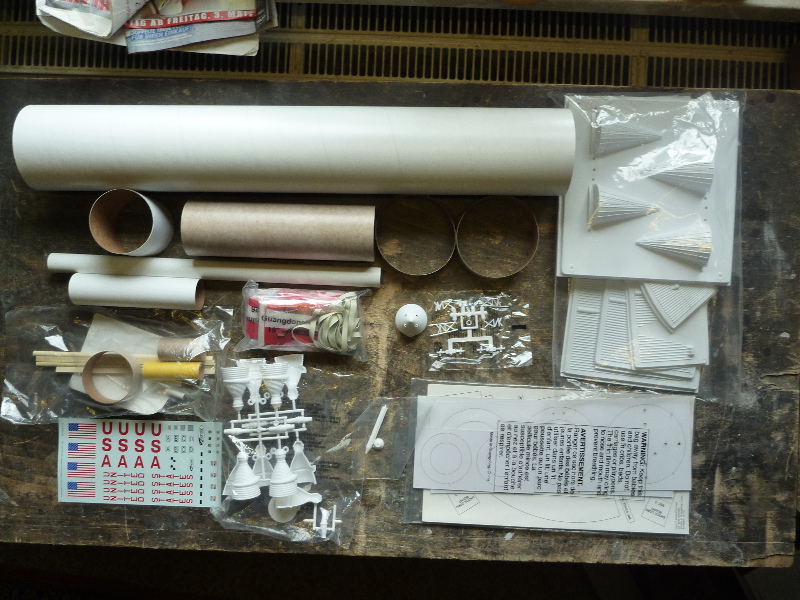 Hier der Bericht des Baus/Umbaus des Estes Saturn V Bausatzes. Der originale Bausatz ist für einen D-Motor ausgelegt. Nach dem Umbau kann das Modell mit einem zentralen H-Motor und/oder als Cluster mit 24mm Motoren geflogen werden. Dies wird auf Kosten einiger Details des originalen Basusatzes gehen. Der Bausatz:  Die original Teile:  Viele Teile müssen verstärkt oder neu gemacht werden. Los gehts mit dem Papprohr des SM/LEM. Dies wird durch 2 Lagen 160g Glas verstärkt: 2 Pappspanten werden durch Sperrholzspanten ersetzt: