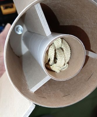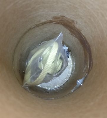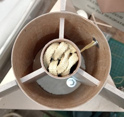 Nachdem sich das Epoxy unten gesammelt hatte, konte ich es -durch Bewegen der Rakete- an den zu klebenden Kanten entlangfließen lassen. Das hat recht gut funktioniert, wenn es auch ein wenig viel Epoxy war...