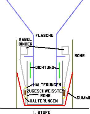 Flasche müsste es gehen. Kann aber sein, dass sich die Kabelbinder so stark an das Rohr pressen, dass sich die Stufen nicht trennen. Vielleicht könntest du den Booster ja durch einen Fallschirm abbremsen. Wie bekommst du den Druck in die Oberstufe? Gruß Robert |