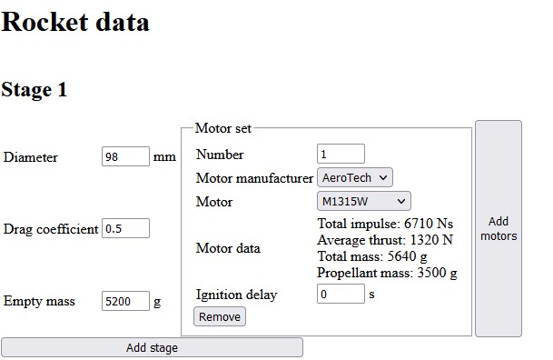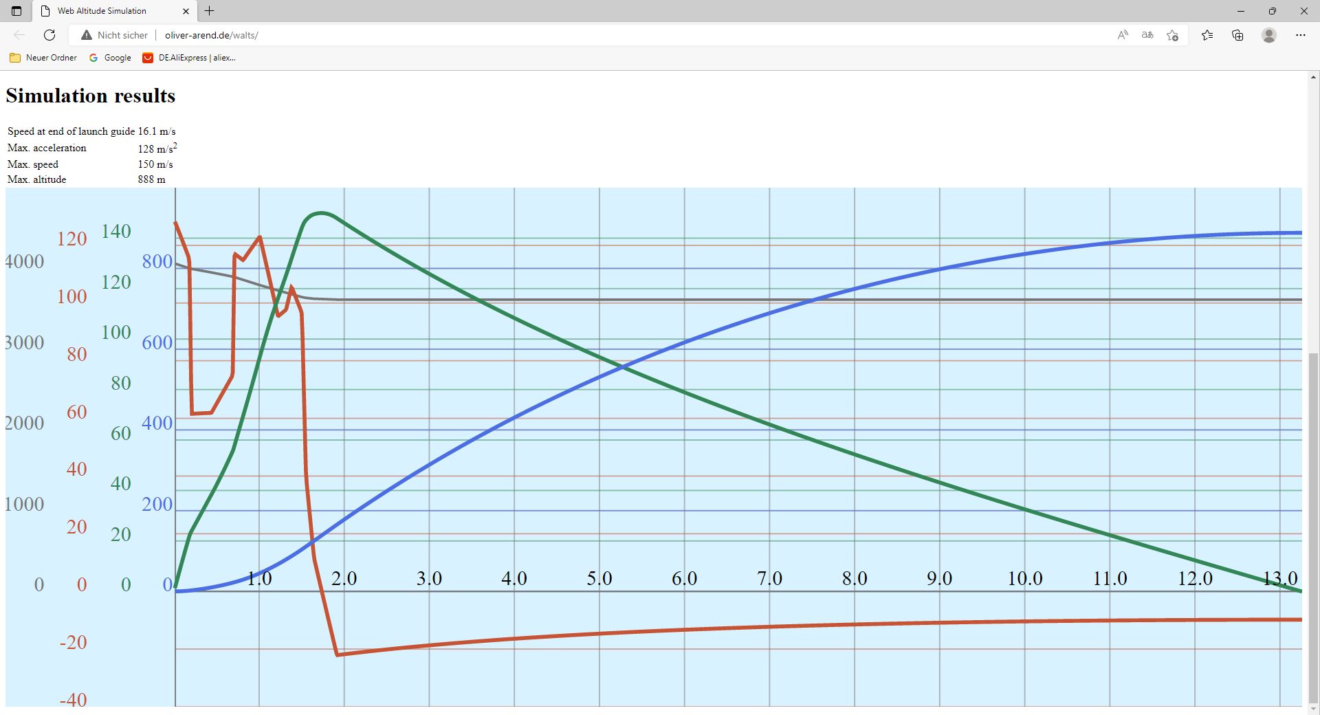 Ich habe in der letzten Zeit immer mal wieder an WALTS, dem "Web Altitude Simulator", gearbeitet. Das ist ein Online-Simulator, der eine ähnliche Funktionalität wie wRASP bieten soll, also auch Cluster, mehrstufige Raketen etc. Als Motorendatenbank wird im Hintergrund Thrustcurve.org verwendet. Ich weiß, dass es dort auch einen Simulator gibt, der einem sogar eine Liste mehr oder weniger passender Motoren ausspuckt, aber das deckt eben nicht alles ab was wRASP so kann/konnte.