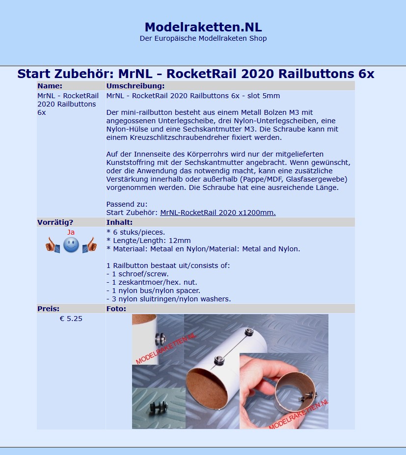 Flossen: Holz reicht erstmal - Flugzeugsperrholz mit 5mm Dicke reicht da auf jeden Fall aus! Retainer: Aeropack ist super, damit kannst Du nichts falsch machen. Falls Du selbst bauen willst, schau mal im Netz nach Kaplow Klips, die sind einfach herstellen und funktionieren ebenfalls gut. Railbuttons: Nimm Einschlagmuttern M4, damit bekommest Du lle gängigen Größen gut verankert. Von innen ins Rohr eingeharzt sind die auch ziemlich unzerstörbar. Oder eine lange Holzlatte mit entsprechenden Einschlag-/Einschraubmuttern längs eingeklebt geht ebenfalls! Viele Grüße, Tom "Intelligenz ist zu wissen, dass eine Tomate eine Frucht ist; Weisheit ist, sie nicht in einen Obstsalat zu tun." Miles Kington (1941-2008) |
