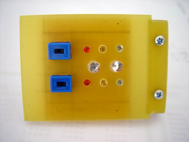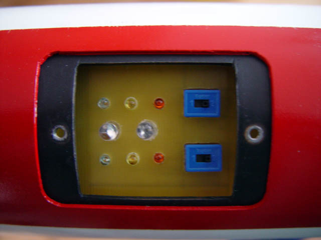 Ein Doppelschalter schaltet beide Elektroniken ein und ein zweiter Doppelschalter schaltet beide gleichzeitig scharf. Die mittleren LED's signalisieren für die beiden getrennten Stromkreise, ob die jeweilige Batterie noch genügend Kapazität hat. Zusätzlich wird der Zustand "scharf" noch akustisch über Piezzo-Signalgeber gemeldet.