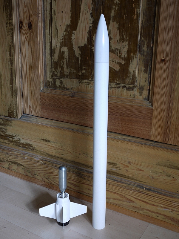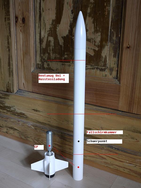 Wie liegen denn da Schwerpunkt und Druckpunkt. Ich habe auch mal für den Microhybrid (unmodifiziert) eine Rakete gebaut und dabei Gesamtgewicht von 200 g angepeilt, musste dann aber wegen des tiefen Schwerpunites die Flossen ziemlich groß machen.