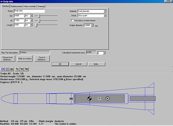 Hm, keine so gute Idee! Der J460 ist massiv schwerer als der I357, und die Rakete hat bereits gezeigt, dass sie sich an der Grenze der Eigenstabilität bewegt. Wenn Du nun an beiden Enden noch einmal massiv Gewicht zugibst, so erhöht sich das Trägheitsmoment der Rakete massiv, nicht aber die Eigendämpfung. Das heisst mit anderen Worten: Die Rakete wird noch mehr "schwänzeln" (viel mehr Ausschlag, langsamere Schwingfrequenz) und kriegt dabei möglicherweise so viel Anstellwinkel, dass sie instabilt wird! Ich würde das an Deiner Stelle nicht versuchen, sondern für L2 eine Rakete verwenden welche zum Treibsatz auch passt. Man kann unter Ausnützung aller aerodynamischer Tricks Raketen wie eine Vostok oder N1 zum Fliegen bringen, gute Flieger werden sie aber nie (im Sinne von "auch für Extremes geeignet). Was Du machen kannst, wenn Du unbedingt die N2 für Deinen Level 2 verwenden willst: Erhöhe die Dämpfung durch zusätzliche durchsichtige Flossen. Das erlaubt Dir gleichzeitig etwas weniger Gewicht in der Spitze nachzurüsten. Solche Flossen stören das Bild in keiner Weise! Gruss Jürg