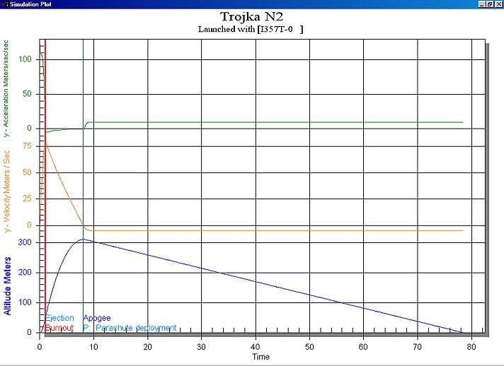Was noch verwunderlich ist: eigentlich sollte sie nach RocSim über 310 Meter kommen (der I357 ist ja soo schlecht auch nicht). Tatsächlich waren es aber nur 175 Meter, also fast nur halb so hoch. Nach RocSim sollte sie eine Geschwindigkeit von ca. 250 km/h erreichen, nach der SALT-Auswertung hatte sie aber in der Aufstiegsphase nur eine Durchschnittgeschwindigkeit von 110 km/h. Woher kommen diese riessigen Abweichungen?!?! Liegt es an dem drag-base des grossen Heckdurchmessers? Viele Grüsse Eberhard Folgende Datei wurde angehängt: