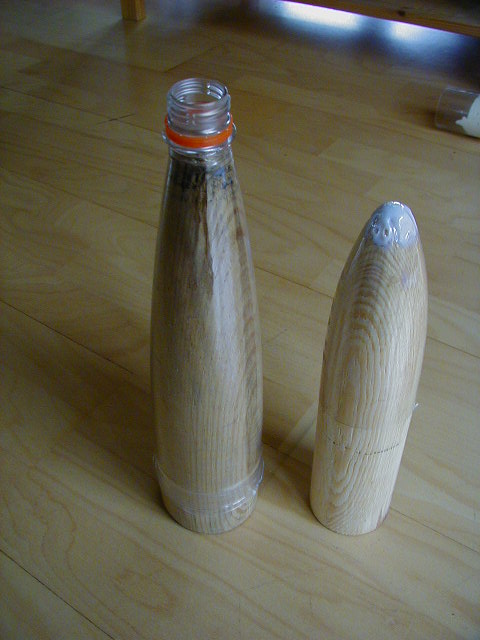 Als Spitze kann man auch den oberen Teil einer Gerolsteiner Flasche nehmen, den Verschluss absägen und dann dendurch Gips/Papmaschee(oder wie man das schreibt) ersetzen, indem man das so formt, das die Flasche spitz zuläuft oder abrundet. mfg Highflyer