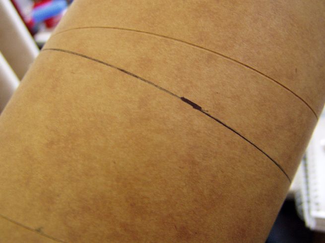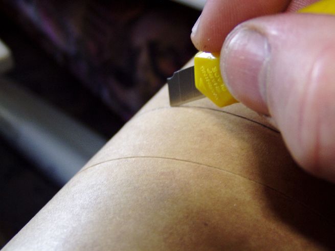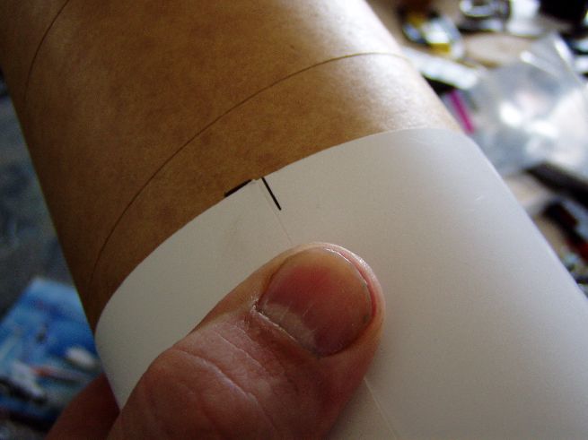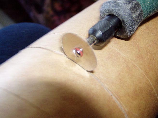 Die fertig ausgehärteten Rohre noch in die richtigen Längen geschnitten. Durch anzeichnen mit einem Stück stärkerem Papier (Kalenderblatt), die Teile markiert und mit dem Cutter vorsichtig und sauber vor geritzt(schneiden keine Chance), anschliessend mit dem Sägeblatt im Dremel durchgeschnitten. Durch das Vorritzen findet das Sägeblatt fast von alleine den Weg :-) Anzeichnen mit Papier: Die Linie an der es gilt entlang zu schneiden :-) Zuerst mit dem Cutter vorritzen: Dann mit dem Schleifer und kleinem Sägeblatt: Anmerkung: Nachdem ich die ersten Teile des Rohres mit dem Dremel geschnitten habe, und pro Teilschnitt ein Sägeblatt drauf ging Habe ich den Rest mit einer kleinen Metallsäge geschnitten, auch mit dem Cutter vorgeritzt und dann schön langsam mit dem Sägeblatt in der Rille Stück für Stück das Rohr abgesägt. Das ging besser und schneller !!