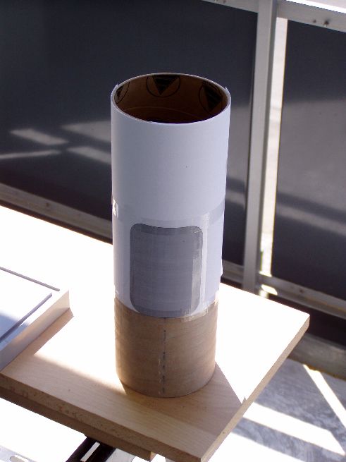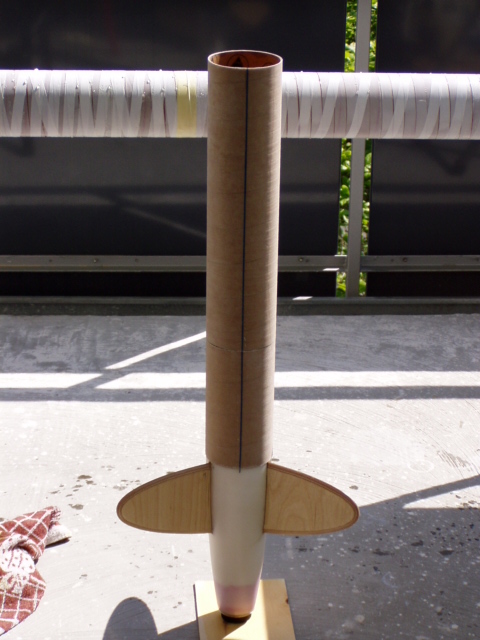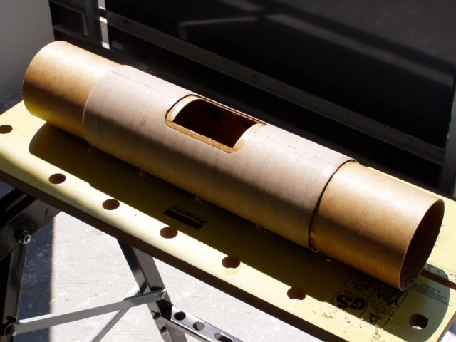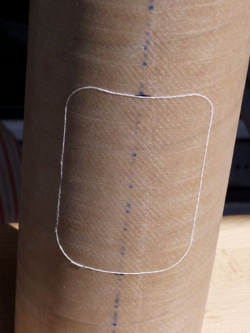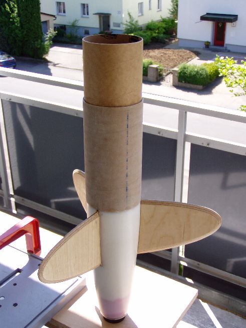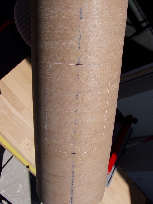 Damit die Elektronik zugänglich bleibt, muss eine Öffnung her. Am PC ein Rechteck mit abgerundeten Kanten gezeichnet und ausgedruckt. Auf dem Mittelteil der Rakete fixiert und mit dem Cutter vorgeritzt. Anschließend mit dem Dremel ausgeschnitten. In den Rundungen der Ecken einen 1mm Diamantfräser benutzt. Dadurch wurde der Spalt ein den Ecken etwas größer, was ich aber durch zurechtschleifen des Deckels gleichmäßig gemacht habe. Innen wird über die komplette Länge ein Kupplerrohr eingeschoben, mit einer etwas kleineren Öffnung, damit der Deckel hält und auch festgeschraubt werden kann.