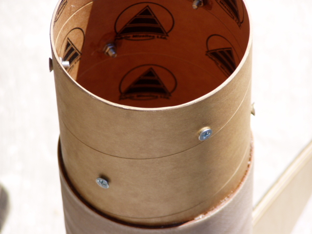An einigen Stellen darf sich die Rakete an den Kupplern nicht trennen und muss auch noch einigermassen zerlegbar sein. Deshalb eine Verbindung mit Schrauben. Die Teile wurden zusammengesteckt mit Klebeband fixiert und dann gebohrt. Anschließend mit dem Kegelsenker für die verwendeten Senkkopfschrauben(M4x8) gesenkt. Innen wurden dann M4-Muttern eingeharz. Durch eindrehen der Schrauben die Mutter fixiert: Dann mit Zahnstocher 5min Epoxy aufgebracht und festgeharzt.(Nichts aufs Gewinde bringen !!!)
