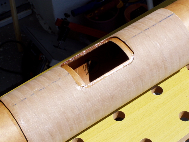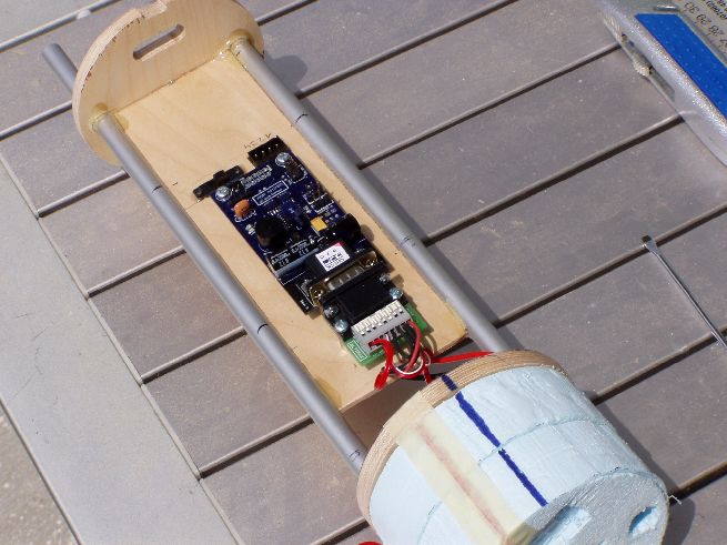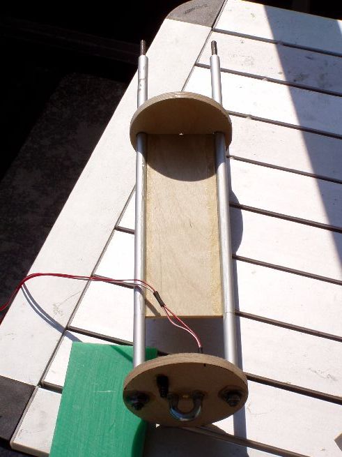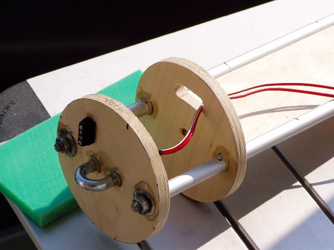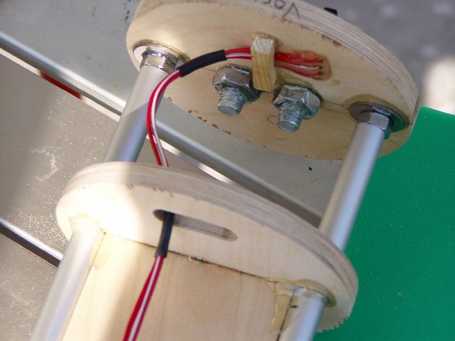 Die Elektronik-Bay wird aus zwei Spanten und einer Gewindestange gemacht. Über die Gewindestange wird die Elektronik geschoben die auf einem Sperrholzbrettchen befestigt wird. An den Seiten des Brettchens sind Alurohre festgeharzt so dass sich das Ganze über die Gewindestangen schieben lässt.