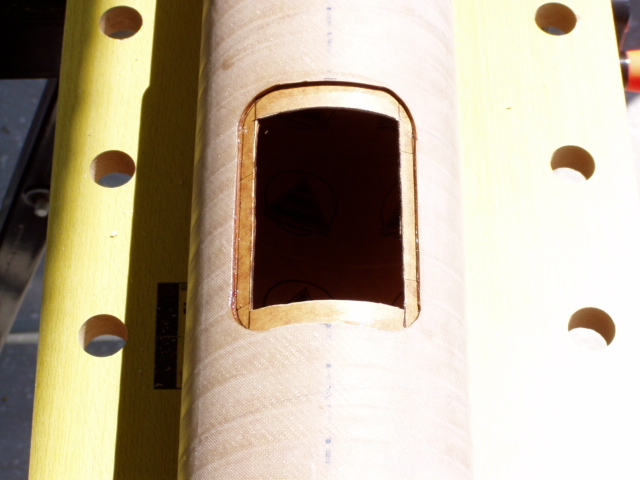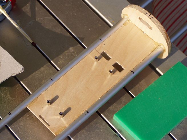 So nur noch eine Befestigungsplattform für die Elektronik zurechtsägen d.h. ein Brettchen, das genau zwischen die Alurohre passt !! Damit das Ganze auch schön stabil wird noch 2 Abschlussspannten an das Elektronikbrettchen Ein Spant mit Öffnung für Stecker !! Mit Bohrschablone noch die Löcher für Altimax gebohrt und recheckige Aussparungen für EIN/AUS und Zünderbuchse mit Laubsäge ausgesägt.