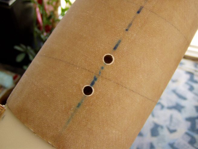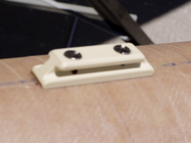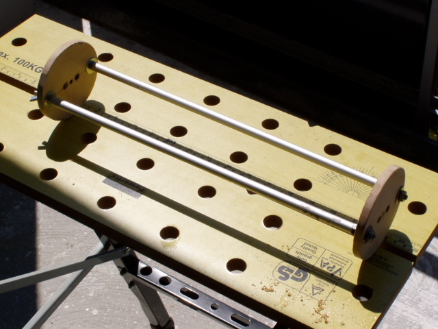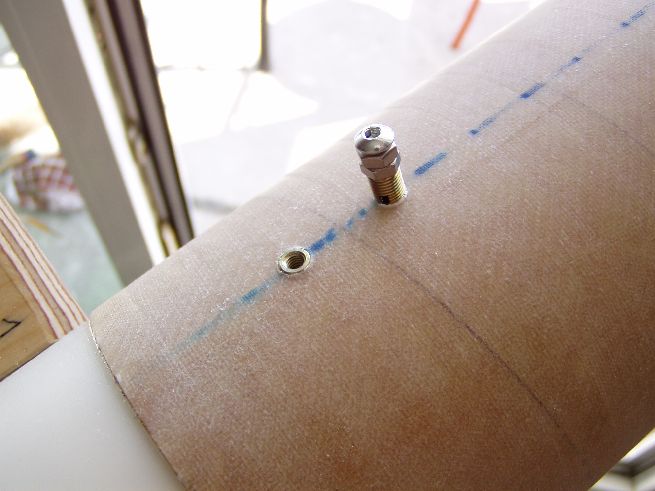 Die Railguides müssen auch irgendwie befestigt werden. Durch einschrauben von Gewindeeinsätzen für Holz und Kunststoffe kann ein schönes festes M4-Gewinde angebracht werden. Zuerst die Löcher gebohrt(Im Heckkonus ja extra eine Holzverstärkung angebracht) Dann mit Hilfe einer Schraube und Muttern die Gewindehülse angesetzt, die Hülse ist auf einer Seite leicht konisch und hat auch einen Schlitzt(nein, nicht zum Eindrehen mit dem Schraubenzieher), dieser dient als Schneide um die Späne abführen zu könnnen. so und dann noch Railguides aufgesetzt und festgeschraubt und Railguides schief...  hmmm....Löcher doch exakt gebohrt !!! Ja, ich schon, aber der Railguides-Hersteller nicht