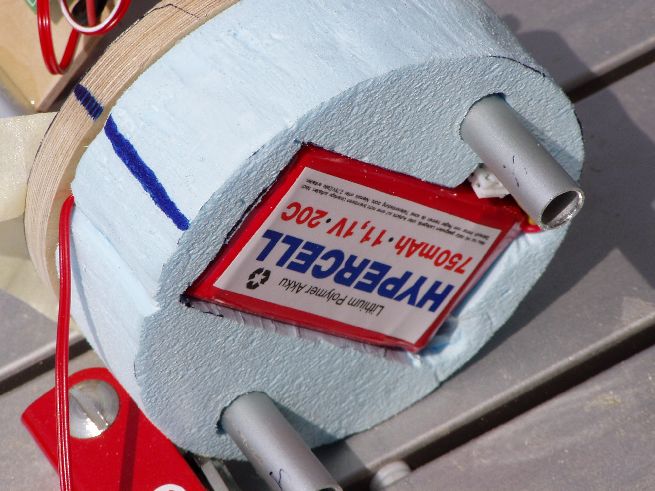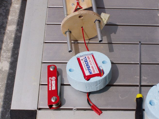 Da die Elektronik ja nicht ohne Spannungsversorgung funktioniert, muss auch irgendwo eine Batterie rein. Ich habe mich für einen Lipo-Akku (3S 11,1V) entschieden, der hat ausreichend Reserve und ich muss mich nicht ständig um leere 9V-Blocks kümmern. Das Ganze schön eingebettet in einen Styrodurspant:  Anschusskabel genau durch Öffnung am Spant Zum Abschluss dann nochmal ein Spant aus Styrodur drauf und dann kann die E-Bay eingeschoben und verschraubt werden
