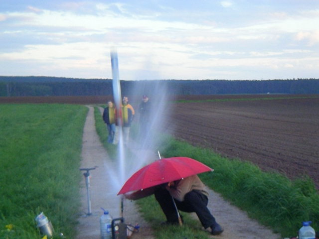 danke fuer die blumen.  das bild wurde nicht fotografiert sondern aus dem video rausgeschnitten, das macht die ganze sache leichter. @rocket das spuelmittel und das bier hatten wir leider ins falsche auto verladen, desahlb mussten wir ohne auskommen.  gott sei dank haben sich doch noch 3flaeschen bier gefunden und wir haben die jungfernfluege auch richtig begossen. @ robby ja da liegt ein kompressor mit einer 12V batterie, hatten aber auch noch eine SKS pumpe dabei. die batterie hat bestimmt fuer 10 starts gereicht, danach mussten wir von hand pumpen. war aber auch kein groesseres problem. der fallschirm und die rakete sind schon fertig, leider fehlt noch der ausloesemechanismus. was mich aber nicht davon abgehalten hat die rakete mit 10bar zu starten. Folgende Datei wurde angehängt: