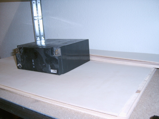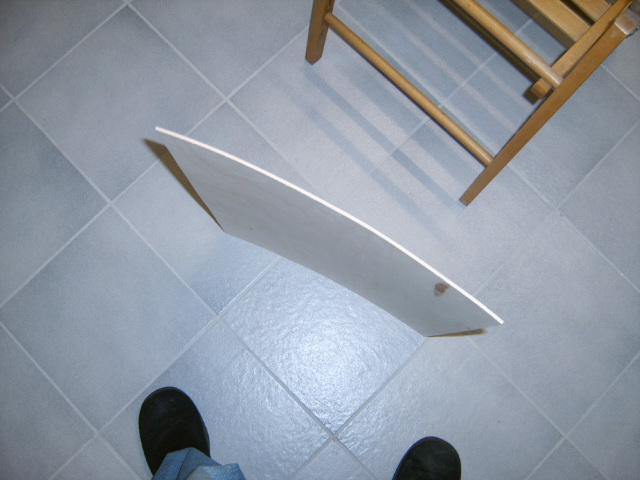 Da ich ganz vergessen habe, dass ich das shockcord noch an einen Spant aufhängen muss, habe ich nochmal drei Brettchen aus Sperrholz zusammengeleimt, da ein 4mm Spant wohl kaum die Kräfte aufnehmen kann. Da mein Sperrholz aus drei Lagen besteht, zeigen immer 2 Furniere in die gleiche Richtung, von der Maserung her. Da sich das Sperrholz nach dem leimen nicht übermässig verziehen soll, habe ich die Brettchen um 90° versetzt verleimt. Nun zeigen 5 Furniere in die eine Richtung(bspw. Norden) und 4 Funiere 90° gedreht in die andere Richtung(bspw. Osten). Nun dürfte sich das gesamte Gebilde kaum noch verziehen, bei dem ursprünglichen Aufbau zeigten 1/3 mehr in die eine richtung, nun zeigt nurnoch 1/9 in die eine Richtung. So heben soch die entsehenden Kräfte beim Schwinden, und beim Quellen fast gleichmässig auf. Hier die verleimten Brettchen: So sieht meine eine Sperrholzplatte im moment aus, dadurch das sich daz Holz verzogen hat, steht sie auch von ganz alleine(Diese Platte habe ich nicht beschwert): So lagere ich meine Holz. Auf einer planen Fläche, gut beschwert(Kiloschwerer Bleigelakku), und vor allem sollte man Sperrholz vor Feuchtigkeitsunterschieden schütze(sprich Küche, oder Badezimmer wäre so ziemlich der schlechteste Aufbewahrungsort)! MfG Fabian
