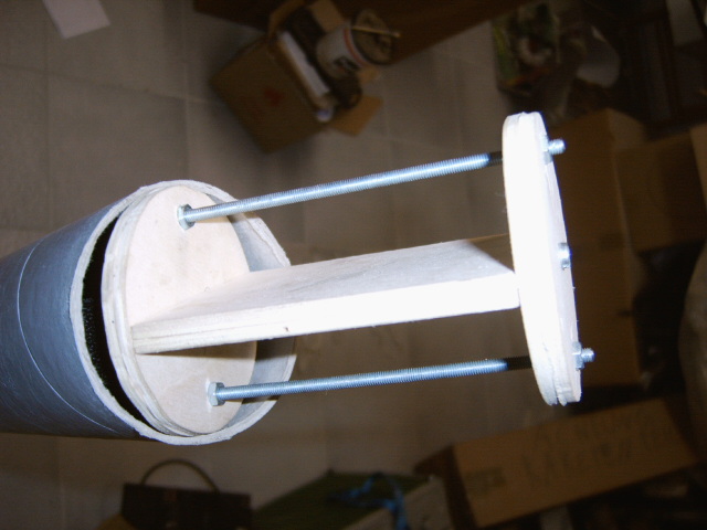 So, heute habe ich den Kolben gefertigt, der auch gleichzeitig als Elektronik Sektion dienen kann, wenn ich ohne Motorausstoß fliegen möchte. Ich habe aus 4 Sperrholzscheiben jeweils zwei um 90° versetzt verleimt, damit diese ein wenig stabiler sind, immerhin wird der Fallschirm daran zerren. auch für die Mittlere Platte habe ich 2 Holzplättchen verleimt. Damit das Ganze noch an Stabilität gewinnt, habe ich noch zwei Gewindestangen mit angeschraubt: Für die Verbindung zu dem Spant in der Rakete, habe ich auf die beiden Gewindestangen ein Aluminium U-Profil geschraubt, dieses hälte den Riemen an dem Kolben fest. Durch die Gewindestangen ist auch eine direkte Übertragung der Kräfte auf die obere Scheibe des Kolbens gegeben: Irgendwie suche ich immernoch etwas anderes zum bauen, wie das Rohr zu schleifen, liegt wahrscheinlich daran, dass das die Arbeit ist, die am wenigsten Spass macht MfG Fabian