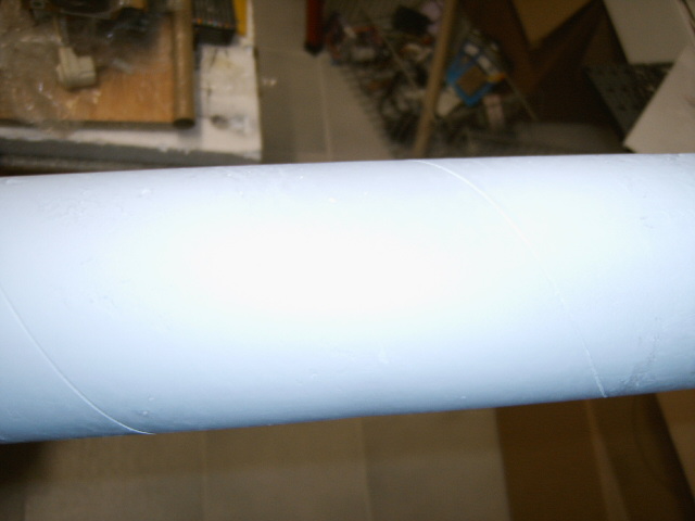 Endlich habe ich das Rohr geschliffen. Vorerst einmal auf P400 nass, an den meisten Stellen ist es doch recht gut und glatt geworden, wenn man jetzt von den Riefen absieht, aber auf die habe ich nun keine Lust mehr: Leider habe ich an manchen Stellen soviel abgeschliffen, das das Papier wieder ein wenig durchscheint, das Problem beim Nassschleifen war, das sich die Pappe ein wenig vollgesogen hat, und leicht aufgequollen ist, dadurch sind einige Hässliche "Pocken" entstanden: Nun muss ich aber erst zusehen, das ich mir eine vernünftigen Lackierkabine baue, dann geht es weiter mit dem Lackaufbau. MfG Fabian