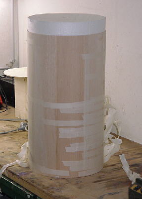 Nach ausreichender Trocknung wird das Balsa nun um den Styroturm gewickelt. Keinesfalls darf das Balsa zu gross sein, sonst wirds ein Ei und kein rundes Rohr. Lieber einen kleinen Spalt lassen, der kann später zugespachtelt werden. Mit Kreppbändern super fest zusammen zurren. Das Balsa muss völlig spielfrei den Styroscheiben anliegen, der Stoss wird mit Uhu hart geklebt. Nach Aushärtung des Klebers werden die Spannbänder entfernt, die Aussenseite des balsarohrs vorsichtig geschliffen und dann mit einer lage Glasgewebe 160g/m2 laminiert. Danach kann das Stzyropor herausgebrochen werden und die Innenseite laminiert werden. Das ergibt bereits eine erstaunliche Steifigkeit des Rohrs. Erst wenn die einzelnen Rohrsegmente später zusammengeklebt wurden, werden zwei weitere Schichten innen und aussen laminiert, so dass die Fügestellen überlappt sind. Folgende Datei wurde angehängt: