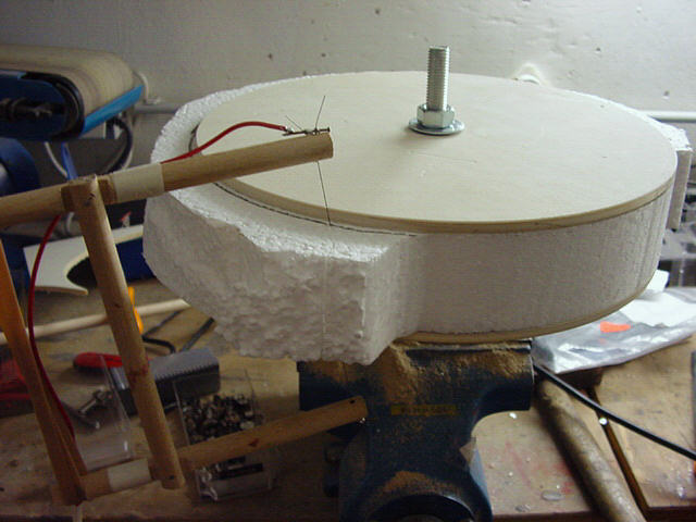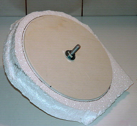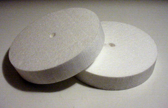 aus einer 50er Styroplatte wird jetzt eine Scheibe, grob, mit etwas Übermass, mit einem alten Lötkolben ausgeschnitten Folgende Datei wurde angehängt: