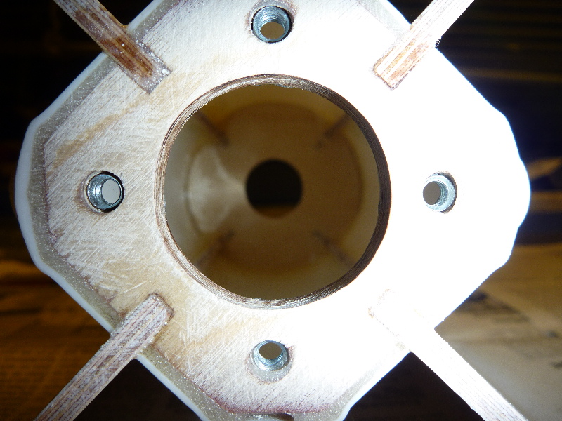 Klar, müssen alle Spanten auch das 29mm Motorrohr später sicher halten. so sitzt dann der Schockspant im Mittelstück. Er hat eine Aussparung für den unteren Rail-Button. Jetzt können alle Teile des Heckkonus, bis auf das Motorrohr, verklebt werden. Hier noch mal eine Ansicht von unten in den Heckkonus. Das gerade ausrichten und fixieren der Flossen beim verkleben entfällt weitgehend. Deren Position wird durch die zwei Spanten mit den Aussparungen für die Flossen vorgegeben. Diese müssen daher bei meiner Bauweise entsprechend genau gemacht und ausgerichtet werden. Im Heckkonus fehlt jetzt nur noch das Motorrohr. "Dicke" Fillets der Spanten und Flossen von Innen sind auch vage zu erkennen. Alles immer schön gebacken auf dem "Drehspieß"