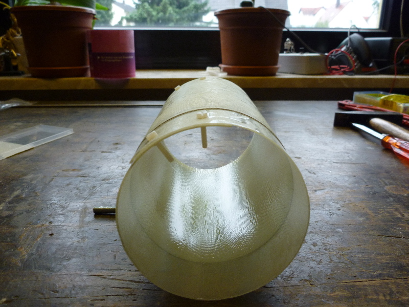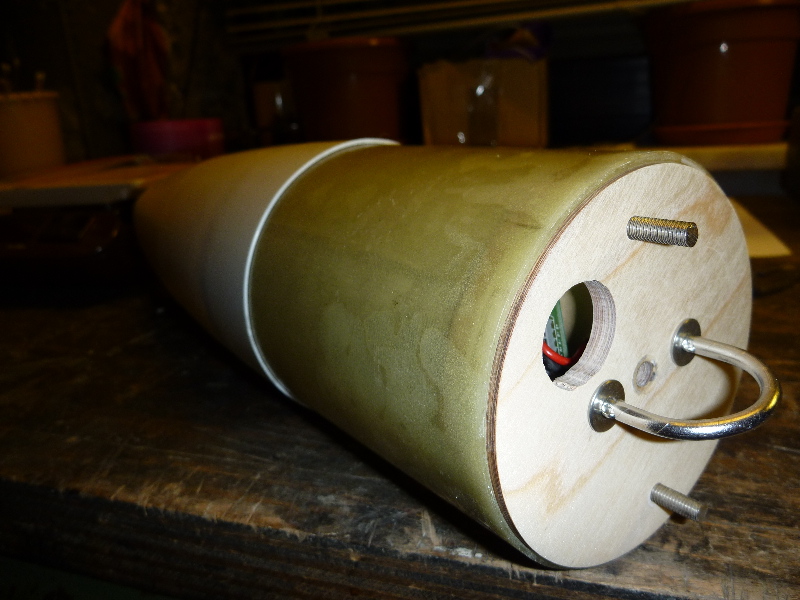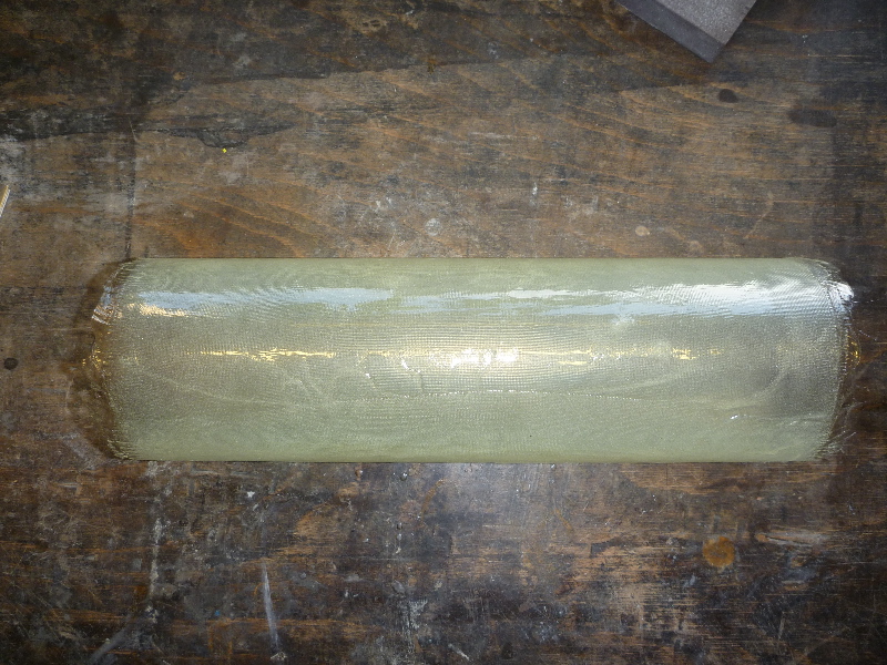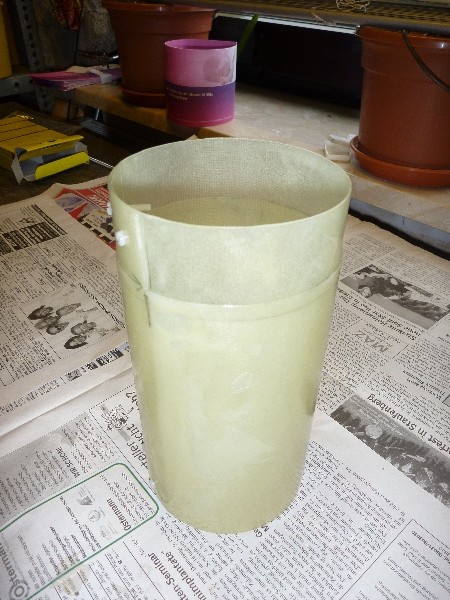 Da der Heckkonus soweit fertig war, stand die nächste Umbauphase an. Die Spitze musste bearbeitet werden und eine Elektronik-Fach geschaffen werden. Im Bausatz war so etwas nicht vorgesehen und kein Platz. Daher brauchte ich ein neues Schulterstück für die Spitze. Um dessen Aufbau zu erläutern hier schon mal ein Blick auf das Ergebnis: Also erstmal ein GFK-Rohr gewickelt. Zellophanfolie als Trennmittel eignet sich bestens