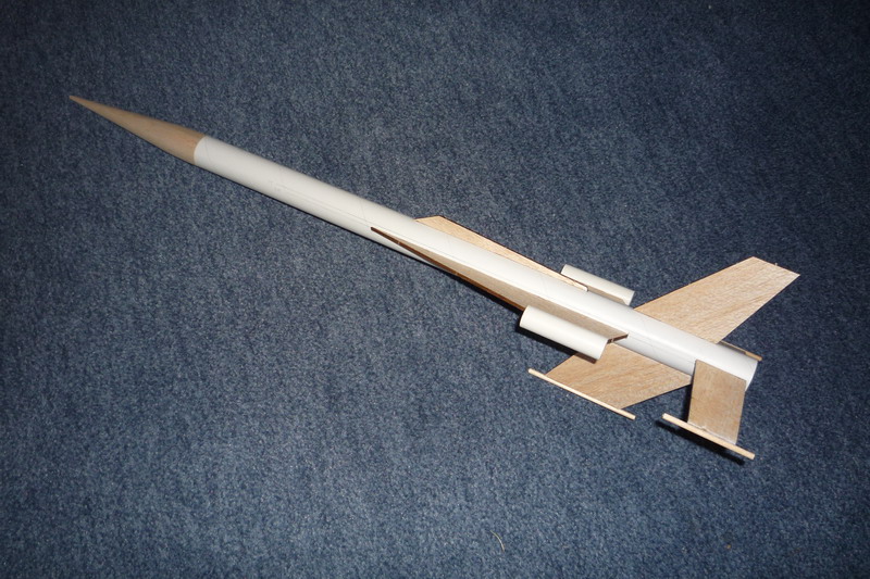 Mittlerweile hat das fast 40cm lange 38mm-Motorrohr oben und unten je einen Zentriering bekommen und wurde ins Körperrohr eingesetzt. Die Aufhängung für die Schockleine habe ich ähnlich wie bei der Jayhawk realisiert. Hier zu sehen der Drahtbügel über dem Motorrohr und der obere Zentrierring. Als Widerlager habe ich noch einen 3cm breiten Kupplerring über den Zentrierring eingeklebt. Zwischenzeitlich war auch die nächste Fuhre Sperrholzflossen in der Presse und wurde mit Glasgewebe verstärkt. Bei so riesigen und langen Flügeln ist eine exakt fluchtende Montage gar nicht so einfach. Nachdem alle Flügel, Fins etc. montiert waren, haben die untere und hinteren Fins noch die Stäbe an die Außenkanten bekommen, die das Original von ESTES auch hat. Hier boten sich Kohlefaserstäbe an, die ich von der Drachenfliegerei noch als Reste rumliegen hatte. Montage der "Triebwerke" aus 29mm Phenolrohr an die Enden der Flügel. Soweit Gruß Jan |