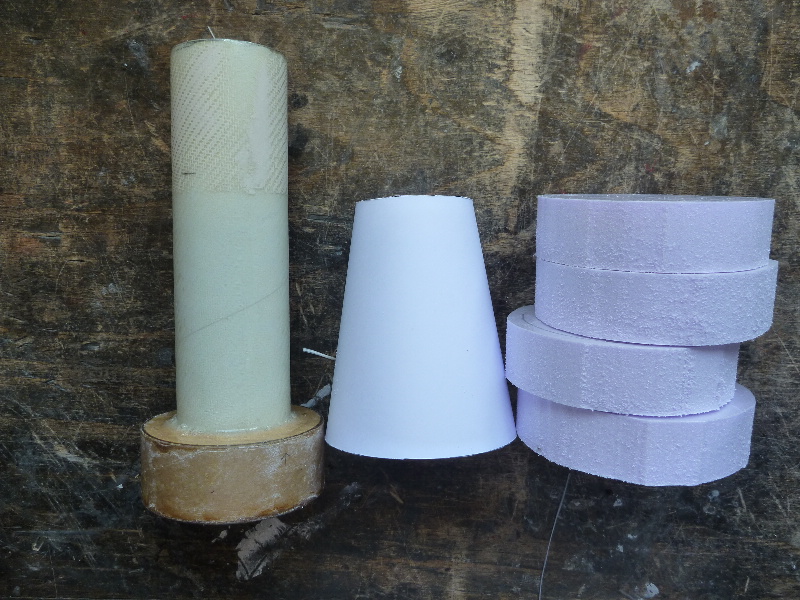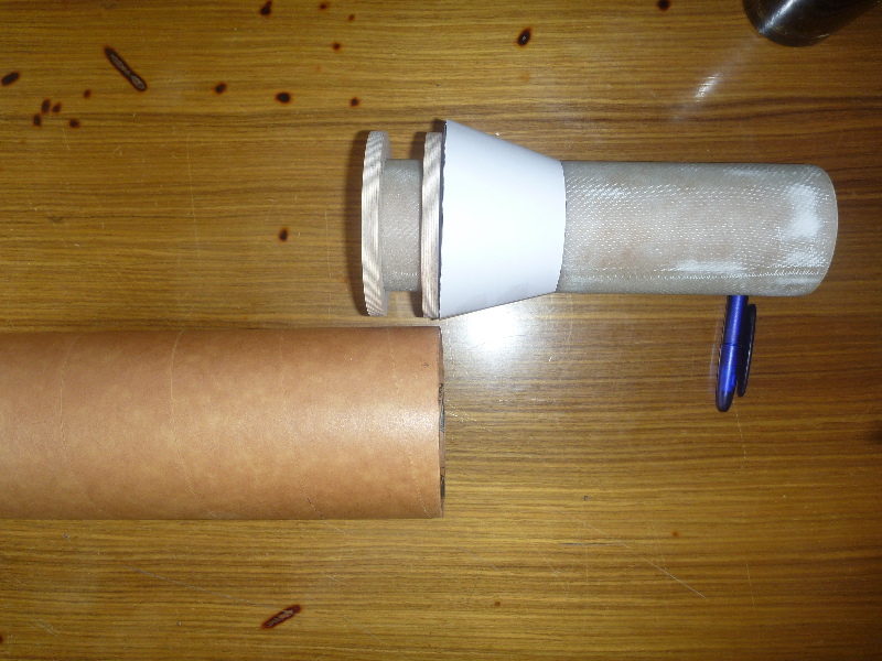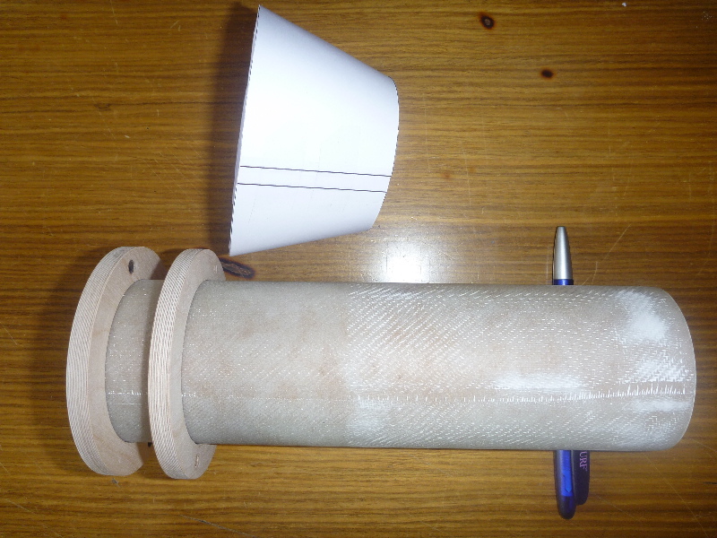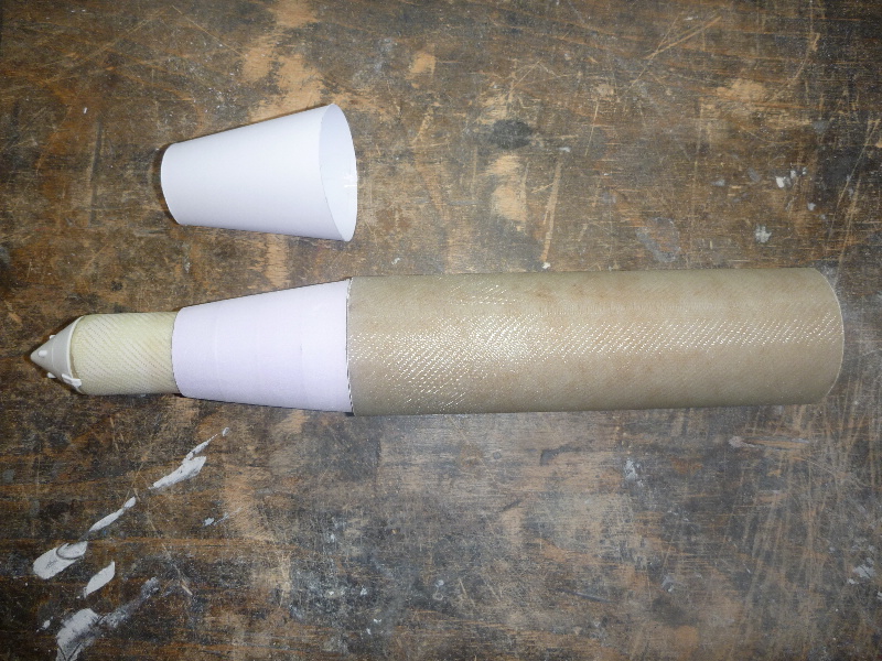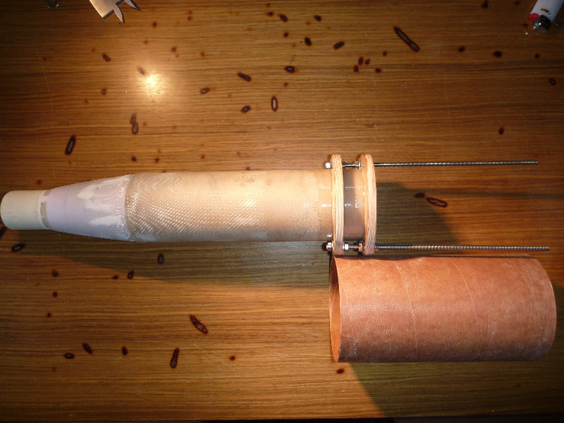 5 Lagen 160er-Glas... ...kommen auf den Konus Diese Teile bilden im Bausatz den Kuppler von der 3. Stufe zum Hauptrohr: Die Spanten werden durch Sperrholz ersetzt. Der Konus wird wieder aus Styrodur gemacht. Darunter kommt dann der Kuppler/E-Bay zum Hauptrohr: