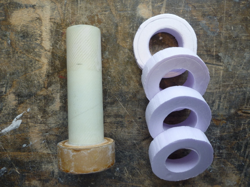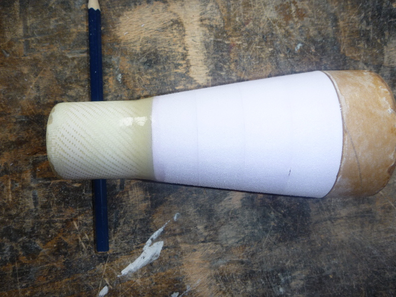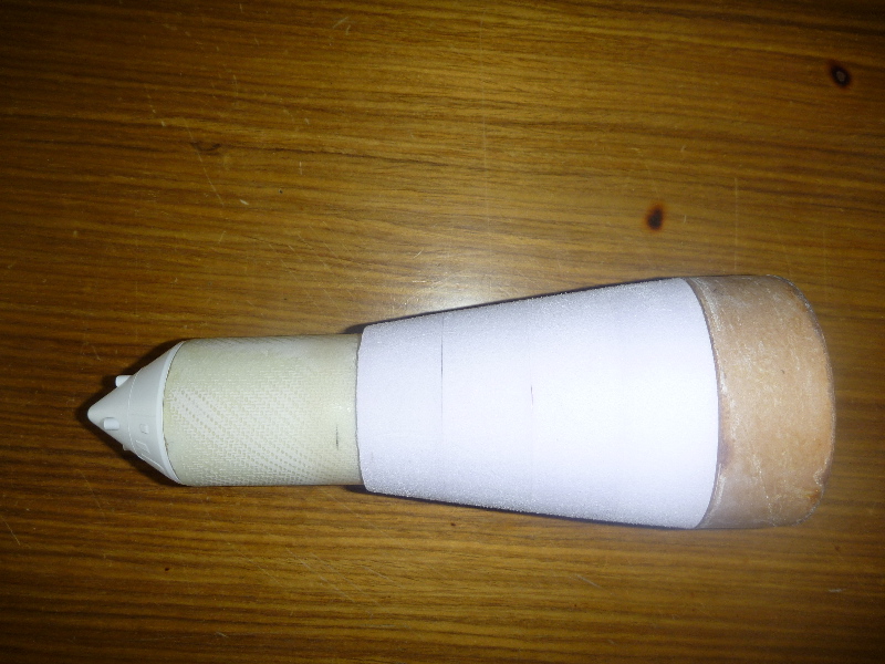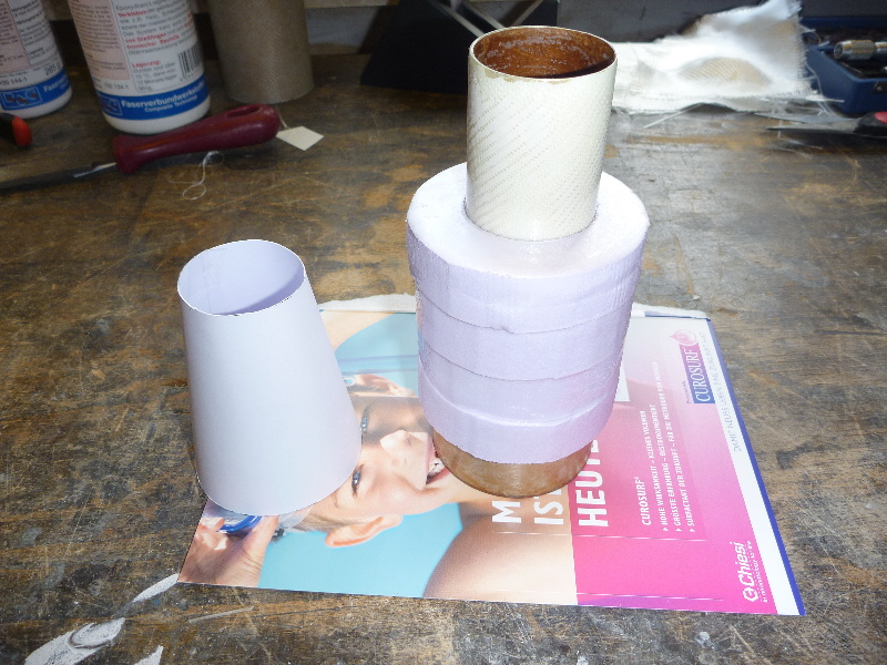 In Handarbeit wird der Konus geformt. Die noch fehlenden oberen 3mm werden später mit einem Epoxydharz-Baumwollflocken-Brei gebildet: Nach dem dem Laminieren des Styrodurstücks werden dann alle Durchmesser wieder zueinander passen: