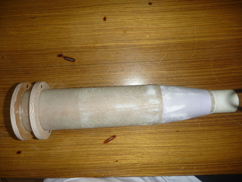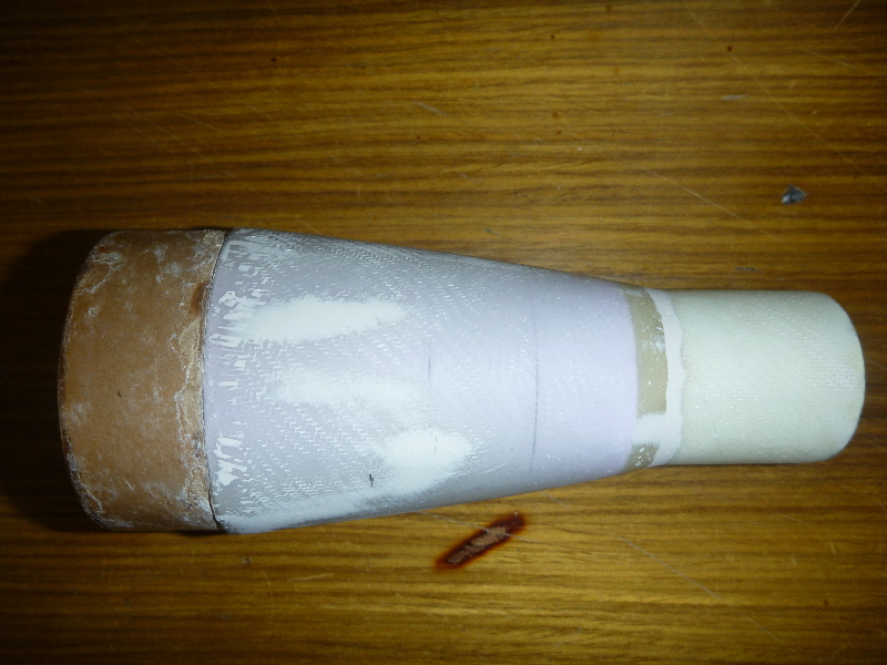 Nach dem Aushärten ist das Teil fertig zum Laminieren: Ich arbeite mich langsam weiter von Oben nach Unten. Das Rohr der 3. Stufe wird, an den später sichtbaren Stellen, gespachtelt und geschliffen: Als nächstes wird dann der Kuppler zum Hauptrohr mit der E-Bay-Sektion gebaut.