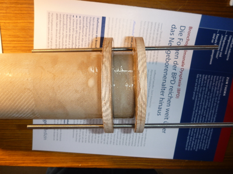 Hi, Neil! Na, du bist ja leicht glücklich zu machen.  Spaß bei Seite: Du hast natürlich Recht: Die Rohre halten hoffentlich ein mehrfaches der auftrenden Kräfte aus. Innen-Laminieren macht schon bei 10cm-Rohren keinen Spaß mehr. So hab ich damals das Ebay-Rohr der Asteria behandelt.  Das Kupplerrohr wieder vorbereitet: Geschliffen, Entstaubt und Entfettet Diesmal ohne Hilfsmittel Laminiert: Hands on, aus der chirurgischen Praxis: eine Lage 80er-Glas