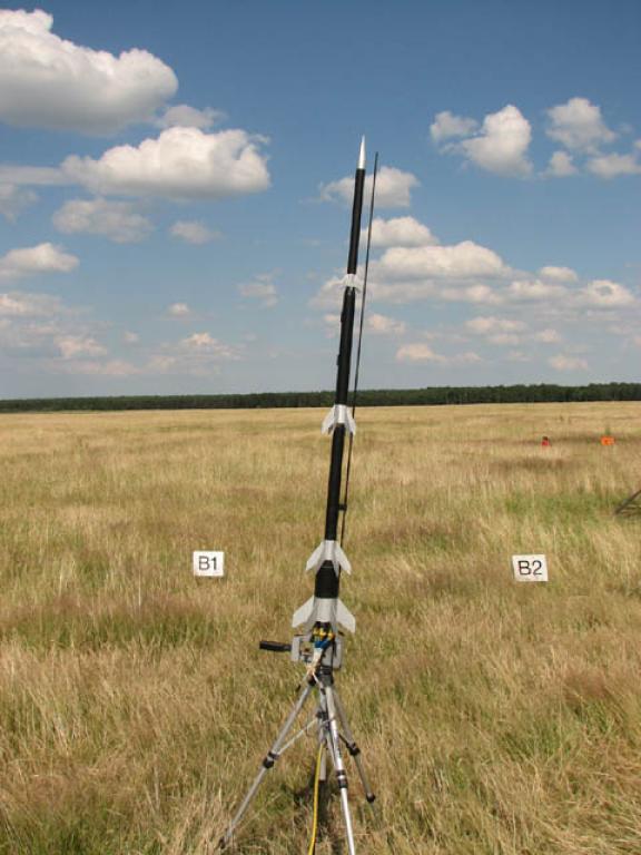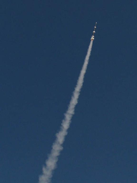 Ein zwar einfaches aber perfekt funktionierendes 4 stufiges (!!!) Modell, welches unser Raketenkollege Adrian aus UK beim RJD-2007 gestartet hat! Das Modell flog super stabil auf errechnete 1300 Meter mit C-Motoren. Alle Stufen haben gezündet, wir konnten die oberste Stufe zwar nicht mehr sehen aber noch hören..... Leider wurden nur die erste und zweit Stufe wiedergefunden. Adrian hält aber immer noch den Rekord des ersten erfolgreichen 4 stufigen Modellraketenstarts in DL mit einer theoretischen Flughöhe von 1300 Metern auf C-Motoren. Ich denke, das kann ihm so schnell auch keiner streitig machen...... Andreas |