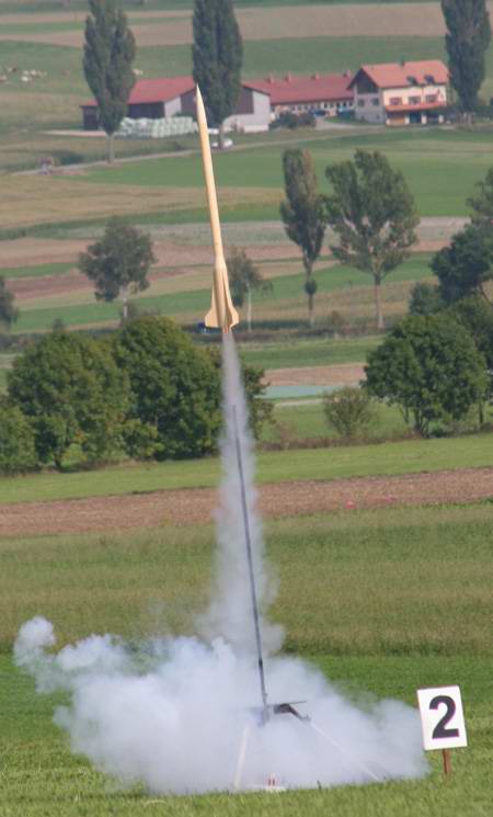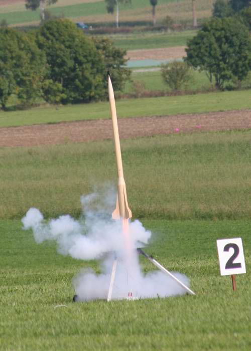 Ansonsten hat mich der erfolgreiche Flug der HdF motiviert mit ähnlichen (und leicht verbesserten) Bautechniken ein noch etwas komplexeres Projekt in Angriff zu nehmen... Herzlichen Dank an Oli4 für die beiden tollen Bilder kurz nach der Zündung und kurz nach Verlassen der Rampe. Oliver |