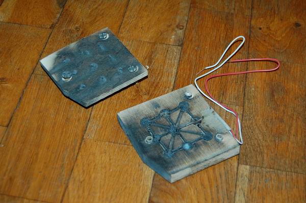 Ich habe zwei Holzplatten mit Abstandshaltern (rund 2 mm), eine hat passende Vertiefungen, die andere passende Bohrungen. Die "Dose" soll mit Schwarzpulver betrieben werden. NC-Pulver ist ja auch wegen der fehlenden glühenden Partikel denkbar ungeeignet für die Zündung von Motoren.