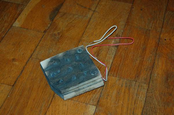 Man sieht rechts unten den Teil der das Schwarzpulver aufnimmt, mit 9 Vertiefungen (für jeden Motor eine) und den Kanälen zur Verbindung der einzelnen Vertiefungen und der Zuleitung für den SN0. Auf der Platte liegen außerdem drei kurze Alurohrstücke, die als Abstandshalter dienen. Die fallen allerdings gerne durch die Gegend, hier gibts Verbesserungsmöglichkeiten. Auf der unsichtbaren Rückseite befinden sich drei Einschlagmuttern, die die Schrauben aufnehmen. Links oben sieht man die Deckplatte, die 9 Bohrungen für die Motoren und drei weitere für die Befestigungsschrauben. Die 9 Flecken stammen von den Abgasstrahlen, die Dose ist wirklich nicht für die Ewigkeit gebaut. Hier sieht man die Dose zusammengebaut. Die abgeschrägte Ecke vorne ist für die Rail. Ich muss die Dose noch um einen Winkel auf der Unterseite ergänzen, der die Zünddose hält und auch mit zwei Railguides ausgestattet ist. So kann man die Dose in die Rail einführen, die Rakete draufsetzen und los gehts. Wichtig ist auch, die Zünddose erst auf der Rampe, wenn die untere Platte fest in der Rampe sitzt, zu befüllen. Ansonsten trifft man zwischendurch zuviele Leute, die "What's this?" fragen, und schon ist das SP rausgefallen. Also ne relativ aufwändige Konstruktion, die nicht lange halten wird, aber sie funktioniert. Kurt Rehberger hat mir auf der Messe noch den Tipp gegeben, dass die Zünddose nach unten wegfallen können sollte, damit die Abgasstrahlen nicht auf das Raketenheck reflektiert werden. Das ist hier natürlich auch nicht gegeben. Oliver |