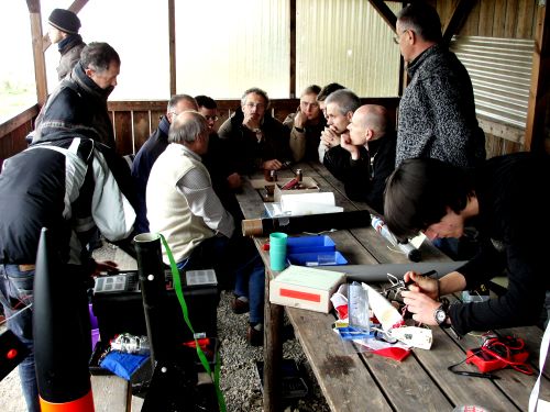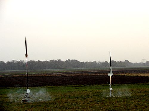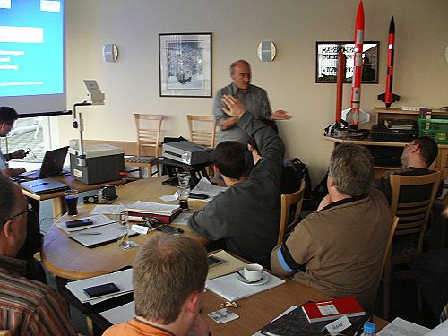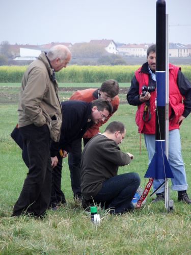 Nachdem wir wieder vom Fluggelände zum Tagungsort zurück sind, um weitere Themen abzuhandeln, möchte ich euch noch das ein oder andere Bild von den Trainingsflügen und deren Vorbereitung zeigen. die Prüfung eines Ausstoß: Raketengleiter als Prüfungsmodell: Unter den strengen Augen der Beamten des Gewerbeaufsichtsamtes: Ein Flug mit etwas Emmision... und ein Synchronstart zweier Modelle Thematisch geht es heute abend weiter mit der Raketentechnik, Konstruktionen und Beispiele. Außerdem werden heute letzte offene Fragen der Teilnehmer abgehandelt. Wir rechnen wieder mit einem Ende gegen 22:00 Uhr ...