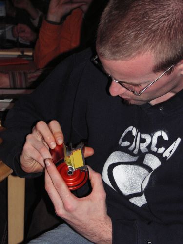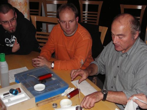 Gestern abend war ich mal zur Kontrolle dort, ob die wirklich soviel arbeiten wie der Tom hier dauernd behauptet. Die schockierende Wahrheit: Das ist alles noch viel schlimmer! Ich hab natürlich Wein, Weib und Gesang erwartet (oder glaubt ihr, ich würde wegen der Raketen dorthin fahren?) und was war- Werkeln, Wiederladen und Gerechne! Lehrgangsleiter Ernst ging um 23:00, nachdem der entnervte Wirt vorher schon zum abkassieren kam. Recht viel mehr kann man in einen Tag nicht reinpacken. Kaum zu glauben, aber die haben trotzdem ihren Spaß  Mal im Ernst: Das läuft prima, sogar das Wetter sieht im Moment noch recht gut aus. Apropos praktischer Teil: Wir sind gestern auf den ungewöhnlichen Fall gestoßen, daß ein SALT die Test-LEDs "zündete", nicht aber die SN0. Ich kann also nur allen raten, egal welche Elektroniken sie benutzen, unbedingt Auslösetests mit dem vorgesehenen Zündertyp zu machen.