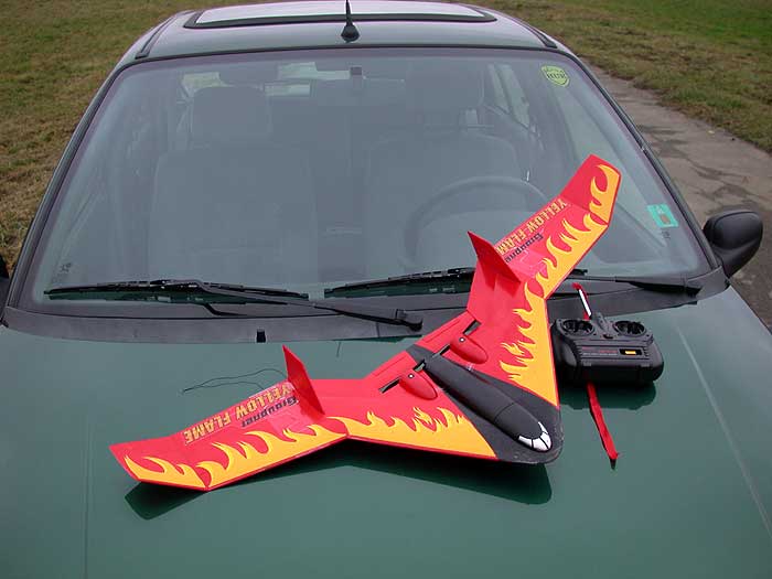 Update: Ich habe die Yellow Flame geordert, zusammengebaut, bin auf den Matscheacker raus, und: es fliegt! Nachdem die erste Anspannung weg ist, macht das Teil sogar richtig Laune. Der Flieger ist nahezu RTF und fast komplett. Es braucht noch 8 Mignon-Batterien oder Akkus für den Sender. Die Ohren müssen mittels Klebestreifen angebracht werden und die Dekobilder aufgepappt, dann ist die Kiste eigentlich schon fertig. Für das Geld liefert Graupner eine, wie ich finde, ganz ordentliche Qualität. Das Flugzeug ist aus Hartschaum, mit einer dicken Lackschicht drüber. Die Leitkanten sind verstärkt, und die Spitze nochmal extra. Unten am Rumpf ist ein starker Kiel, so dass auch Landungen auf Asphalt keine bleibenden Eindrücke hinterlassen dürften. Zwei Luftschrauben und zwei Verriegelungen liegen als Ersatz bei. Die Anleitung ist 16 Seiten stark und sehr ausführlich. Die Energiequelle ist ein Akkupack mit sechs eingeschrumpften AAA-Zellen mit zusammen 400mAh. Nicht gerade der Brüller, aber schön leicht. Vor dem Flug müssen die Zellen zwei Stunden am mitgelieferten Ladegerät hängen.