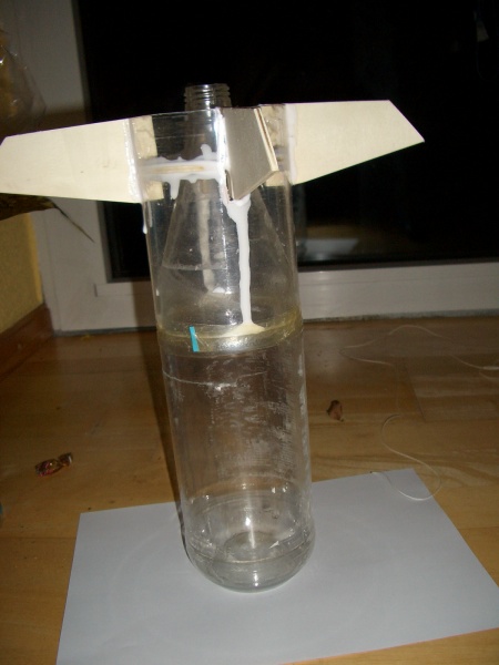 wenn du keinen falschirm hast musste die flügel jedes mal wieder ankleben mach se lieber aus ner doppelschicht PET. Und dann von mir aus auch mit holzleim ( der hält erstaunlich gut auf PET  ). Basti