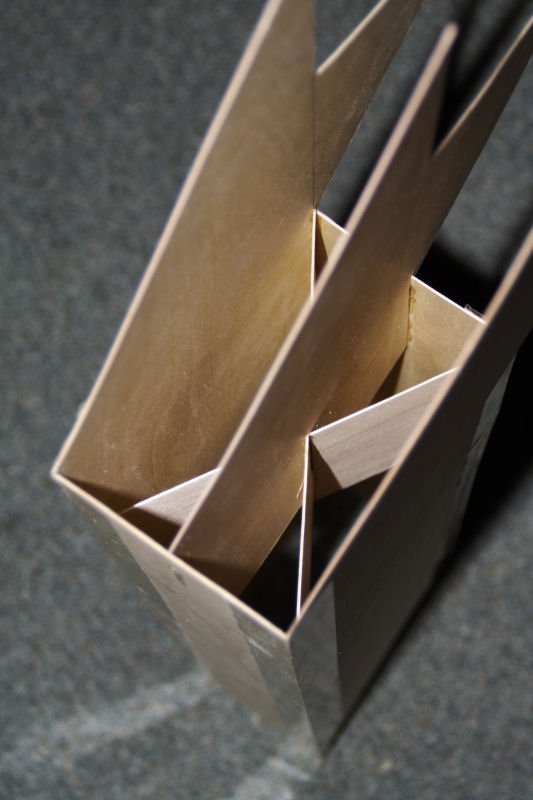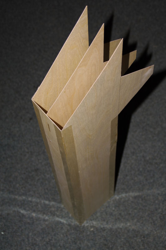 Ich hab mich mal um dieses kastenförmige Leitwerk gekümmert. Der Händler hier um die Ecke ist fantastisch. Der hat alles an Holz, Kunststoff, Gewebe, Harze usw. da was das Bastlerherz begehrt. Beim 0,8 mm Flugzeugsperrholz hab ich mal zugegriffen und ein Leitwerk der "Friede" gebaut: Das Leitwerk hat eine Länge von 80 cm, der rechteckige Querschnitt hat die Maße 15x9 cm. Im Innern, an der Stelle wo das Leitwerk mit dem Raketenkörper verbunden wird, ist die kastenförmige Struktur durch kreuzweise eingeleimte Rippen verstärkt worden: Die Leitwerksflosse wiegt, so wie es da steht knapp 300 Gramm. Sssssccccchhhhitt! Die 2000-Gramm-Grenze werde ich wohl sprengen. Hm, gefällt mir nicht wirklich. Leichter hätte ich die Flosse nicht bauen können. Aus Balsa oder Depron bauen ist Käse, da bricht die ja sofort ab. Wenn man jetzt mal statt 2000 Gramm 2500 Gramm als Leergewicht annimmt, erzählt der Simulator was von ca. 80 Metern Flughöhe. Das sind 10 Meter weniger als vorher kalkuliert. Tja, wat nu? Diese ganze Scale-Sache vergessen und nur auf geringes Gewicht achten oder 10 Meter weniger an Höhe in Kauf nehmen und dafür ne etwas schönere Rak fliegen? Vielleicht kann man ja beim Tank durch Laminieren noch einen weiteren bar Startdruck herauskitzeln. Mal noch ne Nacht drüber schlafen. Gruß Robert @ Michael: Nee, die Bank hab ich wieder abgebaut. Aber das ist so eine einfache Halterung für die Bohrmaschine mit einer Zentrierspitze auf der Gegenseite. Vielleicht kennst du sowas? Geändert von robby2001 am 03. Juni 2008 um 23:50 |