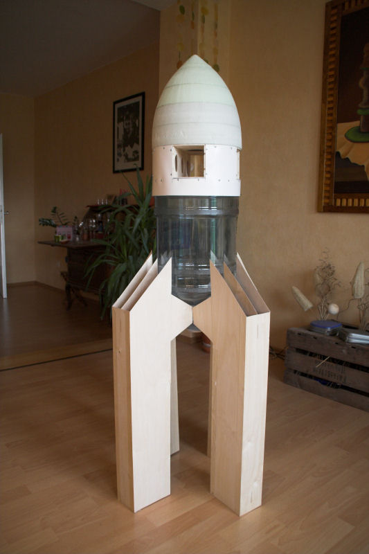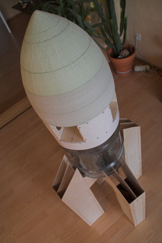 Es ging mit der "Friede" weiter. Das Leitwerk ist nun fertig und ich habe für die erste "Anprobe" die Teile mal zusammengesteckt. Die Rakete ist ca. 1,45 m hoch und ein ziemlicher Brummer geworden. Hier mal Fotos: In den nächsten Tagen geht´s weiter. Dann muss ich mich um die richtige Befestigung der Flossen kümmern. Weiterhin wird der Tank mit dem Filamentklebeband umwickelt und eine dünne Verkleidung für den unteren Teil der Rakete gebaut. Und dann geht´s ans Fallschirme nähen. Gruß Robert |