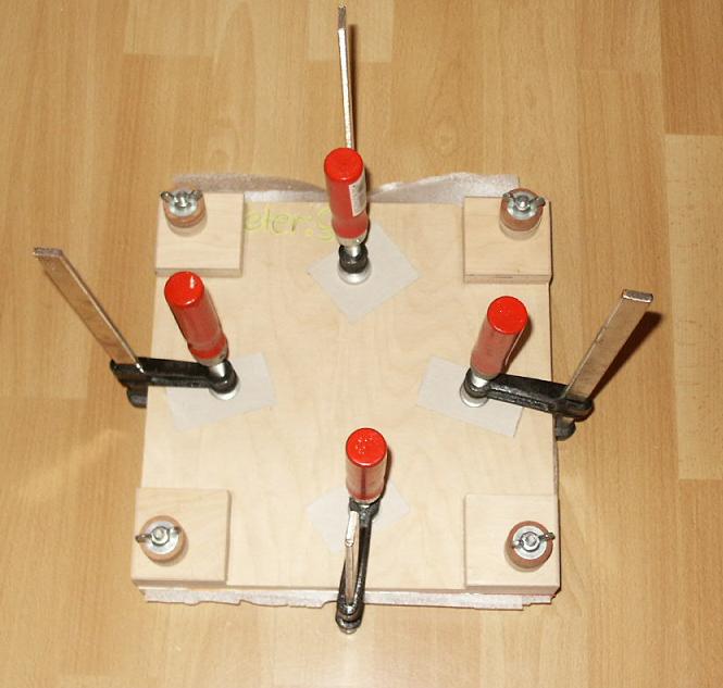 ich würde ein Kreuz aus dem Multiplex bauen und es von Schraube zu Schraube als Rahmen hochkant auf die Platten schrauben. Ich habe auch mal gesehen, das sowas wie eine Blattfeder verwendet wurde. Diese wird dann so aufgeklemmt, das sie auf der Platte in der Mitte aufliegt und am Rand dann herunter gedrückt wird.