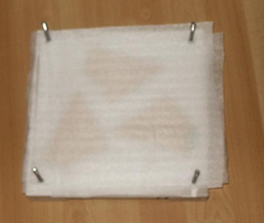 Jetzt kommt die Presse in Einsatz. Wie ich schon - paar Beiträge höher- gezeigt habe kommen die Flossen in die Presse. Dann wieder Schaumstoff plus Karton.... und jetzt machen wir die Presse zu. Paul