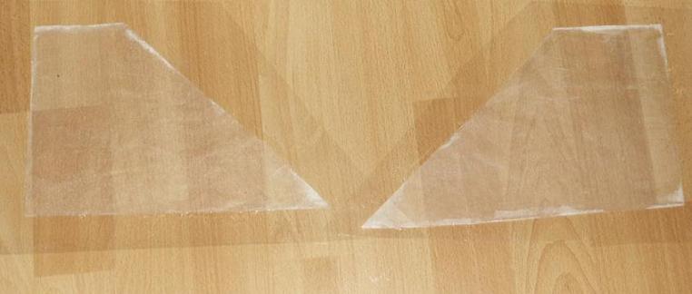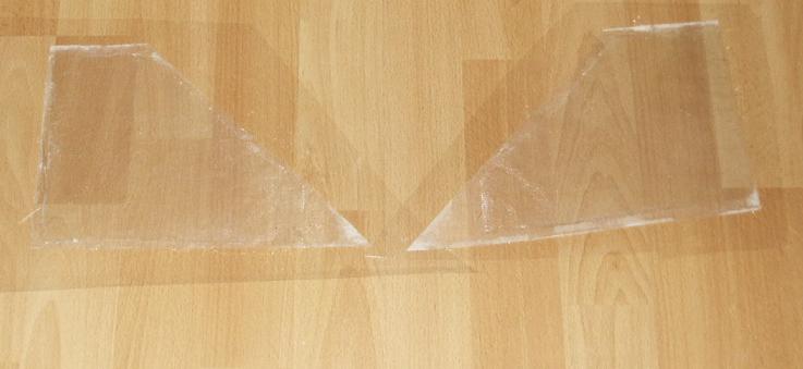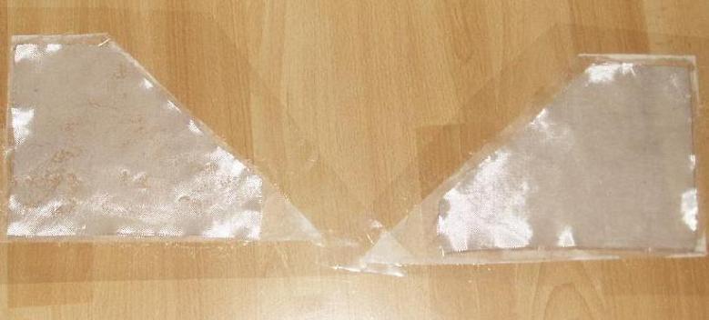 Sooo, es geht weiter. Jetzt werden die Flossen laminiert. Zwei Stück Zellophan werden ausgeschnitten mit reichlich Übermaß und das Spannpapier drauf gelegt und laminiert. Dann GFK drauf und genau so wie mit dem Spannpapier, schön mit Harz durchgetränkt. Paul