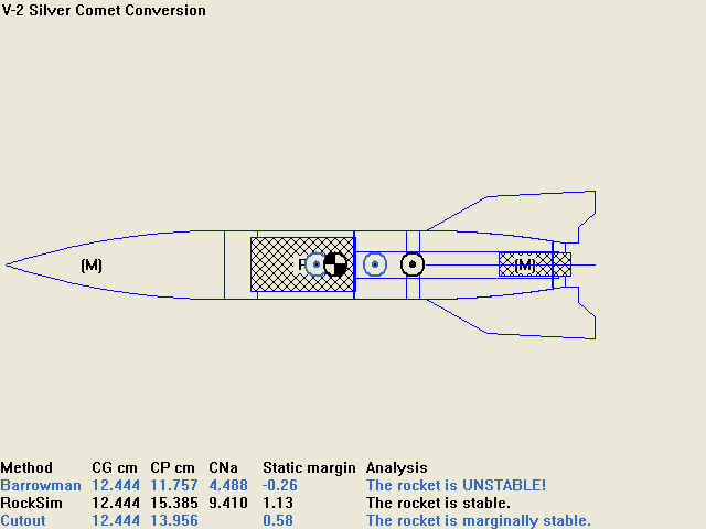 Kommen wir zu einem anderen Problem der V2/A4: Alle mir bisher bekannten Modelle der V2/A4 brauchten mehr oder weniger Trimmgewicht in der Nase. Nun liegt Jan-Hein's Modell keine Beschreibung bei, was eigentlich für einen erfahrenen Modellbauer auch kein Problem ist. Aber was machen wir mit der Trimmung? Mit Spacecad lässt sich die V2 nicht berechnen, die Flossenform und der Heckkonus machen da Probleme. Wie geht Rocksim damit um? Soweit ich weis basiert Rocksim nicht auf Barrowman, oder?
