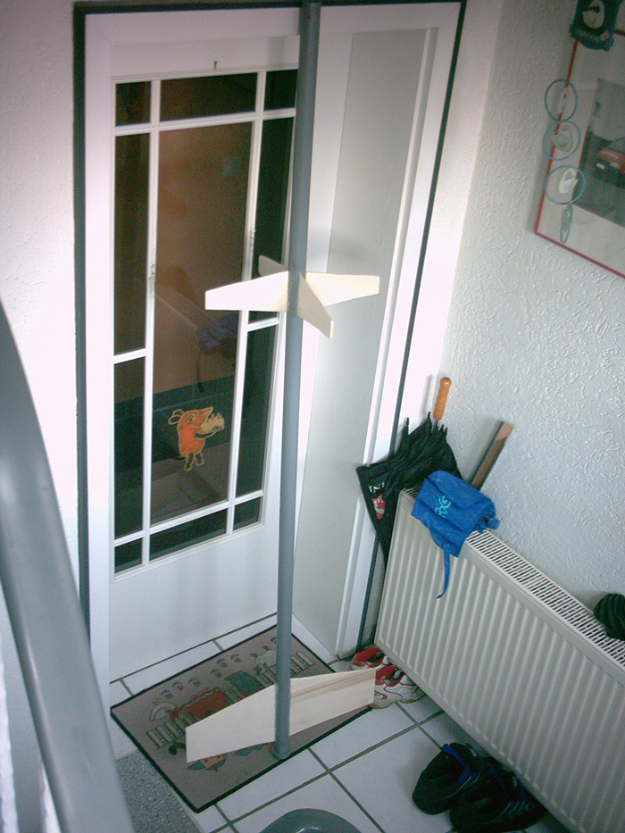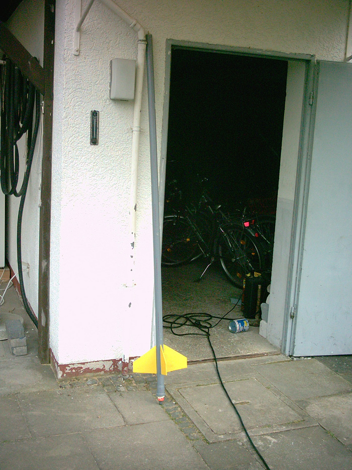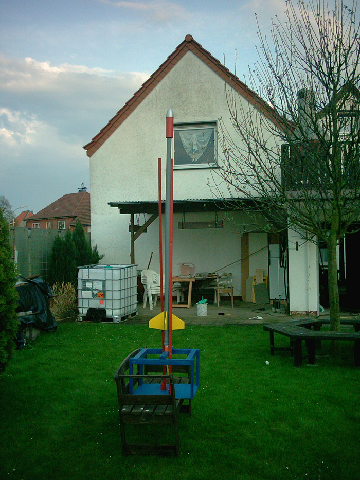 Fast fertig meine Träumer Rak. Ich hab gestern im Baumarkt noch das fehlende Stück für die Rak gefunden und nun ist sie bereit für den Jungfernflug der für Montag geplant is. Ich hab die Spitze mit Hilfe einer zusammengerollten Kellogspackung und der Spitze einer Lavalampe(die wurde sich auch perfekt als Form für Spitzen eignen). Die Halterung hab ich acuh heut fertig gekriegt, wobei hier nur noch leichte korrekturen nötig sind! Aber ich weiss noch net wie ich die Rak an den Stangen(rot) führen soll??? Wie macht ihr das bisher?(die Stangen sind verstellbar) Hier das Foto!!!!!!!!!!!!!!! Hi Ich habe das Bild verkleinert, bitte nur Bilder mit der Maximalen Breite von 700 Pixeln. Wenn du deiner Bilder nicht verkleinern kannst: Da lade dir doch Ifran View runter, da geht es ohne Probleme.