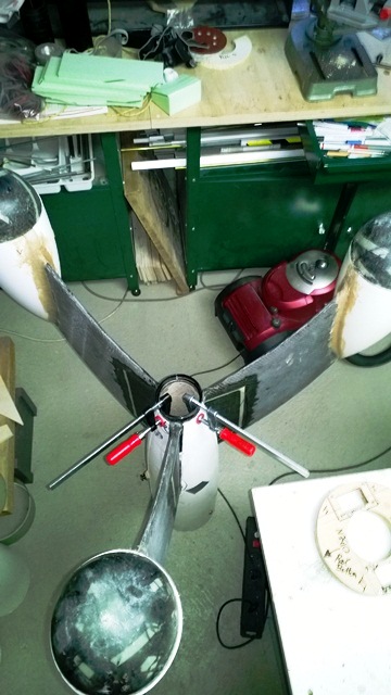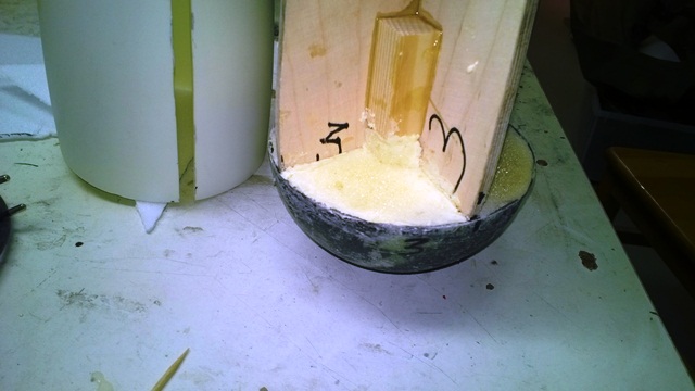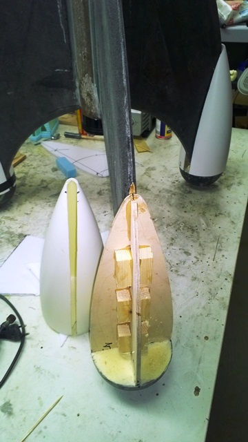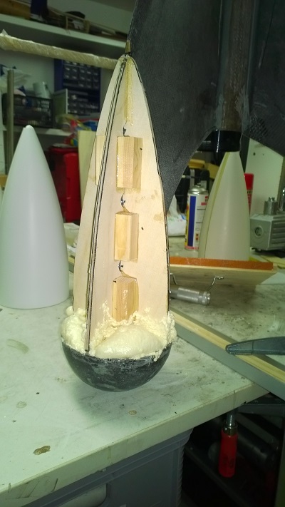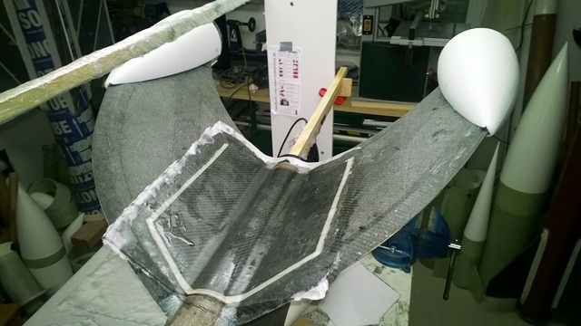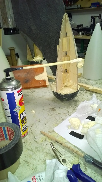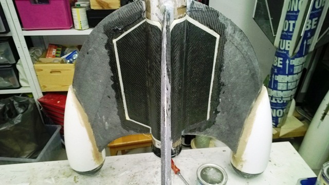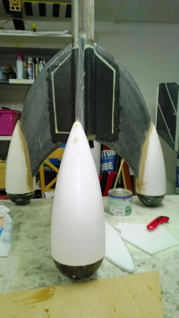 Alle Fins am MM mit CFK verstärkt, alle Pods geklebt und verschlossen (GFK Spachtel, sieht noch übel aus..schleifen wird spassig..)