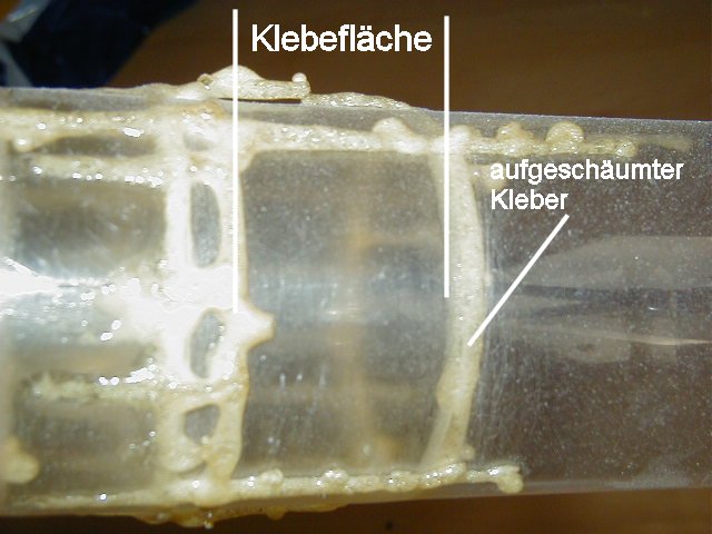 Moin! @ Speckknoedel: Also ich find´s komisch, dass sich überhaupt Blasen an der Klebefläche bilden. Ich hab unten mal ein Bild einer SST-Klebung von mir drangehängt. Wie du siehst hat der Kleber an der Klebefläche überhaupt keine Blasen gebildet. Erst dort, wo der Kleber aus dem Klebespalt austritt schäumt er auf. Also ich kann mir das nur so erklären: der Anpressdruck zwischen deinen Flaschen ist zu gering und der Kleber füllt den Spalt durch Aufschäumen aus. Wie schwer oder wie leicht lassen sich denn die Flaschen zusammenschieben? Brauchst du dazu viel Kraft? Gruß Robert Folgende Datei wurde angehängt: