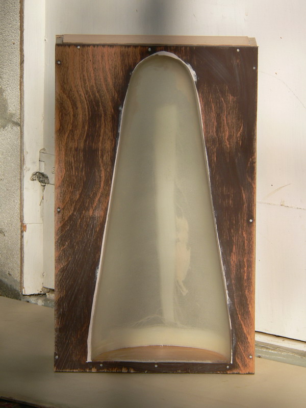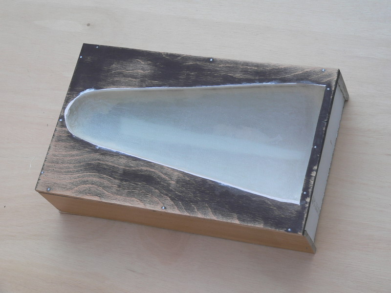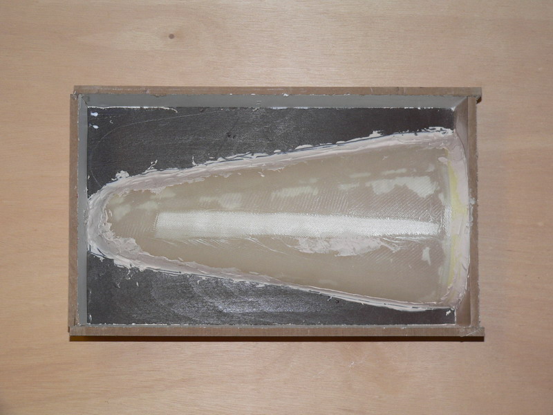 Beim trennen von Spitze und Form sind lediglich ein paar Klebstoffreste in der Form hängen geblieben, welche leicht zu beseitigen waren. Die Halbschale wurde bündig in einem schnell zusammengezimmerten Holzkasten verleimt und verspachtelt. Von oben gesehen. Die Ränder sind exakt geschliffen worden. Fertig poliert und mit Trennwachs eingepinselt wartet die Form nun auf den eigentlichen Zweck. Mit feinem Glasgewebe mehrfach laminiert troknet nun die erste Hälfte. |